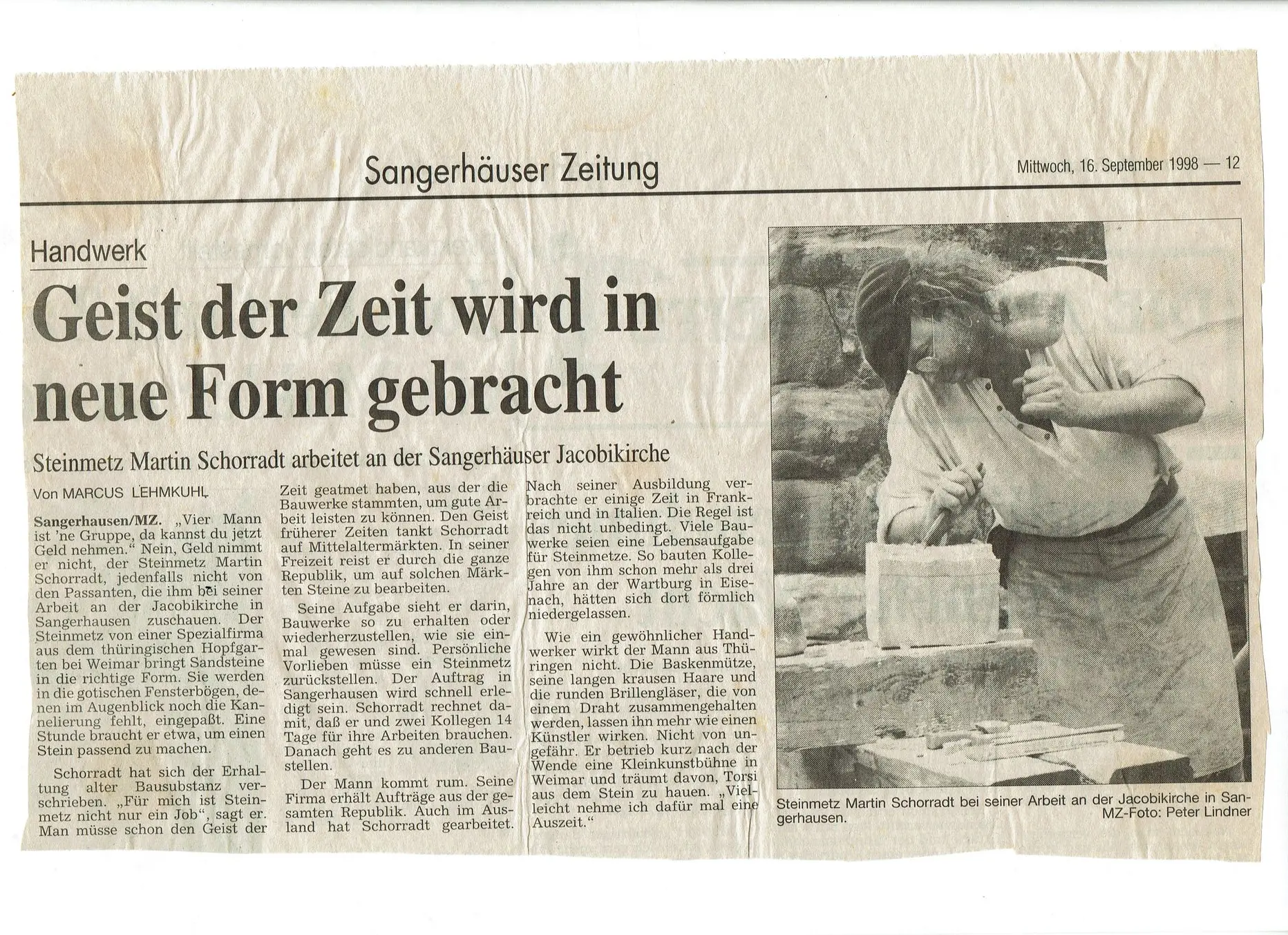 Nach der Ausbildung zum Steinmetz verbrachte Martin Linßi einige Zeit in Frankreich und Italien. Er arbeitete als Geselle in verschiedenen Spezialbetrieben für Steinrestaurierung und Denkmalpflege. Linß machte sich im Jahre 2000 selbstständig.. In seinem Atelier nahe Weimar arbeitet er an Passstücken, Profilläufe und Maßwerke für denkmal geschützte Bauwerke. Er ersetzt Kleinteile von alten Steinfiguren oder erschafft Steinbrunnen. Auftragsarbeiten führte er in Österreich und für Irland aus. Er sucht im Bereich der Dekmalpflege stets eine enge Zusammenarbeit mit dem Bauherren, Fachbetrieben, Steinrestauratoren, Architekten und der zu ständigen Denkmalpflegebehörde, um für die Projekte und Bauvorhaben die günstigsten Lösungen zu erarbeiten.. Priorität hat in der Regel die Bewahrung der historisch wertvollen Substanz.